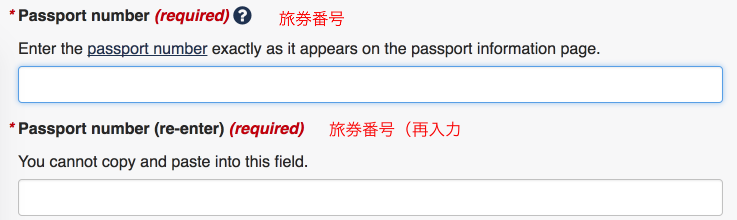 パスポートに記されている英字2桁・数字7桁、計9桁の番号を入力する。再入力の欄にも同じ番号を入力。コピー・ペーストできないので間違えないよう注意。